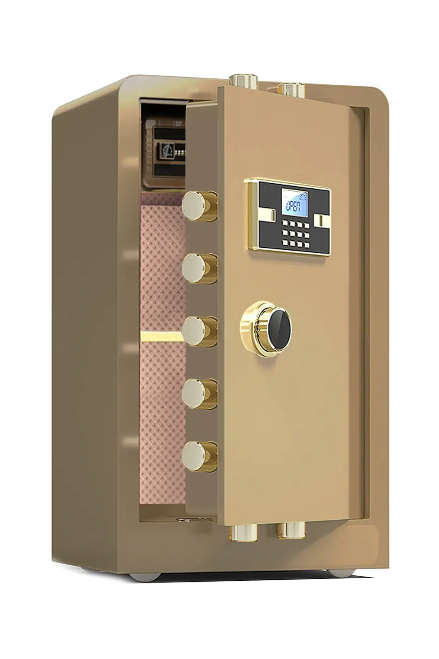 Bu çelik kasa, güçlendirilmiş katı çelik duvarları ve güvenlik çelik kapı kilitleme cıvatalarıyla son derece dayanıklıdır. Ayrıca, korozyona ve leke tutmaya karşı koruyucu toz kaplama, kasanızı uzun ömürlü ve güvenli kılar.